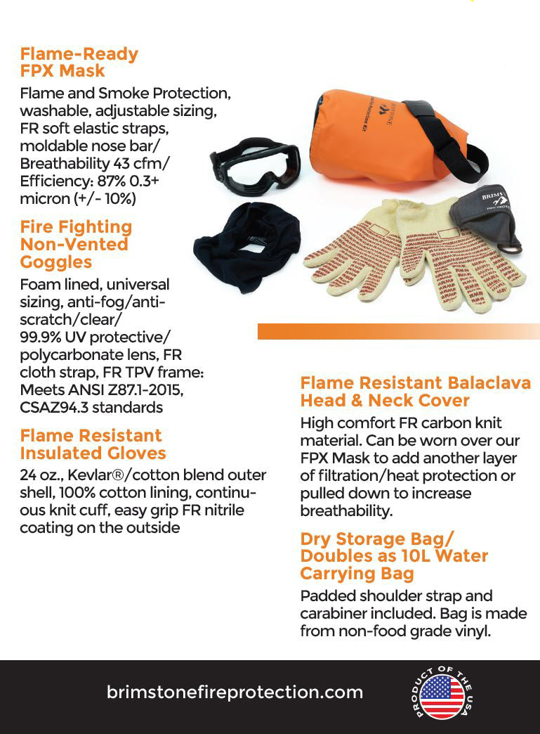 Kit disclaimer: The mask in this kit does not supply oxygen, nor is it suitable for use as a gas mask. Those with heart and/or respiratory issues should use this mask with caution. Every situation and user is different; for this reason, Brimstone Fire Protection cannot guarantee your safety when using this PPE kit during a fire. Use any of this PPE kit’s contents at your own risk.