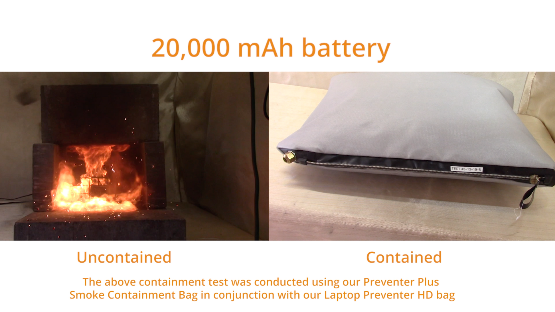 • Tests show that our Large Preventer Li-Ion Fire Containment Bags can successfully contain 50 Wh thermal runaway events.